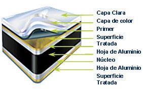 ALPOLIC® está compuesto por un núcleo termoplástico de polietileno de baja densidad intercalado entre dos láminas de aluminio de 0.5 mm de espesor.